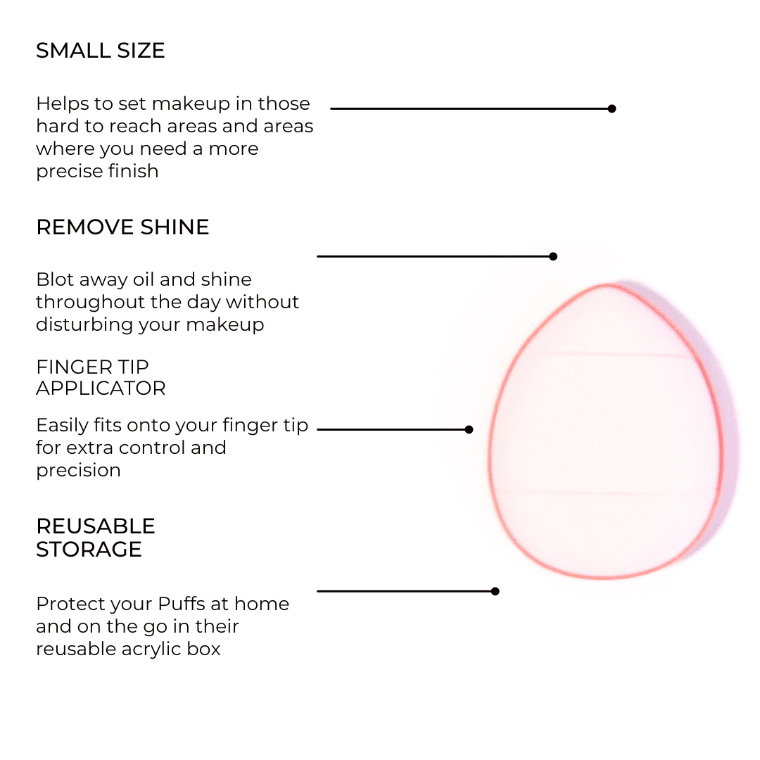 The Fondant Puffs easily pop onto your finger to easily blot away shine and set your makeup and their reusable acrylic storage pot is perfect for travel or on the go touch-ups.